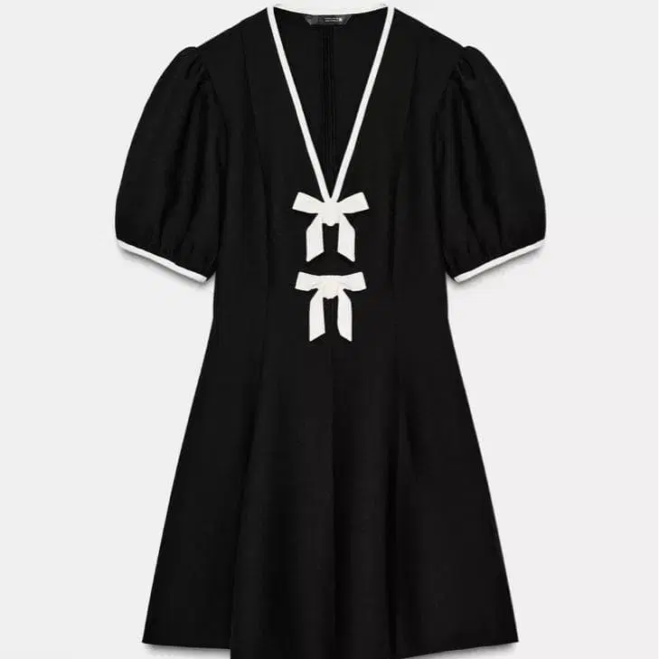 엘레강트한 블랙 미니 원피스, 퍼프 슬리브와 리본 디테일 포함. 택은 제거했지만 미사용품입니다. - 색상: 블랙 - 디자인: V넥, 리본 포함 - 소매 스타일: 퍼프 슬리브 - 스타일: 미니 원피스 - 특징: 심플하고 엘레강트한 디자인 - 디테일: 화이트 트리밍 포함 방문해 주셔서 감사합니다.
