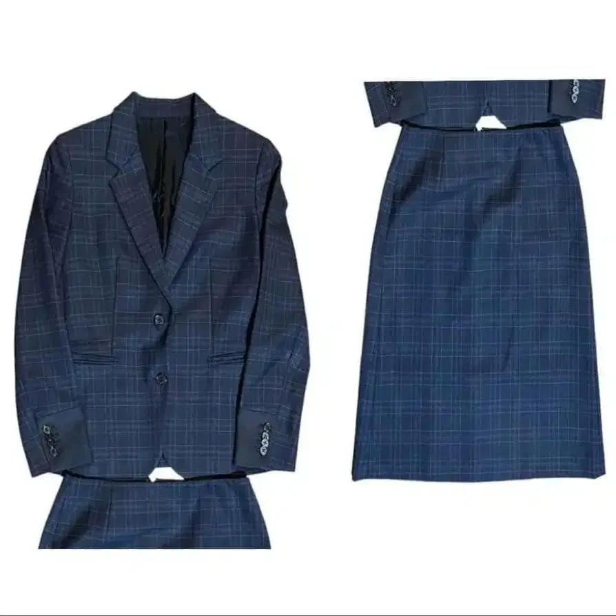 네이비 체크 무늬의 2버튼 자켓과 스커트 세트입니다.
