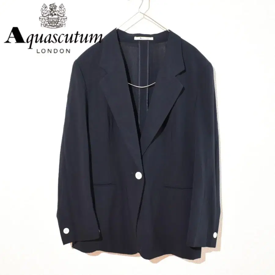 심플한 디자인의 네이비 테일러드 자켓. 어깨 패드 포함.