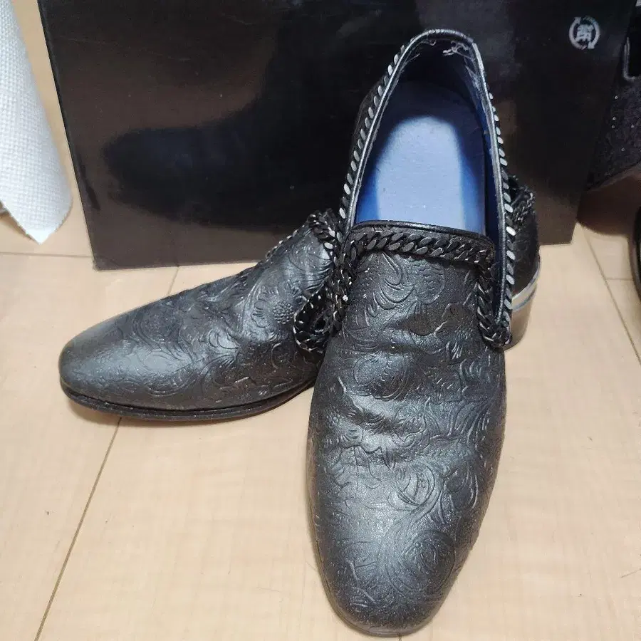엠보싱 가공된 블랙 가죽 로퍼 원래는 화이트 로퍼였습니다 (별도로 미사용품 판매 중입니다). 스타일리시한 디자인에 체인이 있어 쿨한 디자인입니다. - 색상: 블랙 페인팅 - 디자인: 엠보싱 가공 - 스타일: 로퍼 - 소재: 가죽 - 굽 높이: 중간 굽 방문해 주셔서 감사합니다.