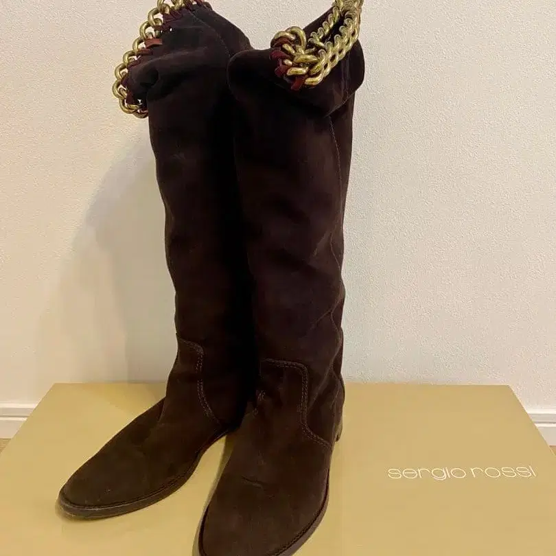 Sergio Rossi 롱 부츠 스웨이드 체인 로우 힐 세르지오로시 다크 브라운 스웨이드 소재에 체인 장식이 더해진 롱 부츠. 접어서 두 가지 스타일로 연출 가능한 2way 디자인. - 브랜드: sergio rossi - 색상: 다크 브라운 - 소재: 천연 가죽 스웨이드 - 장식: 체인 포함 이탈리아제 size 37 상자, 수납 가방 포함 수년 전 구매 후 몇 번 착용하지 않고 보관했습니다. 밑창의 데미지도 적어 비교적 새상품급이라고 생각합니다. 여유 있는 통 너비와 플랫 디자인으로 편하게 신었던 것으로 기억하지만, 롱 부츠를 신을 기회가 많지 않아 판매하려고 합니다. 방문해 주셔서 감사합니다.