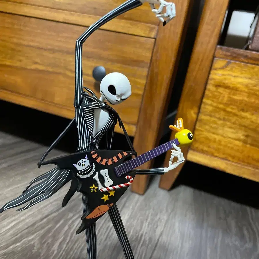 잭 스켈링턴 피규어 스탠드 포함, 기타를 든 디자인. 오랫동안 본가에 장식해 두었던 물건입니다. 눈에 띄는 상처는 없지만 미세한 흠집이나 얼룩, 색바램이 있을 수 있습니다. 양해 부탁드립니다.