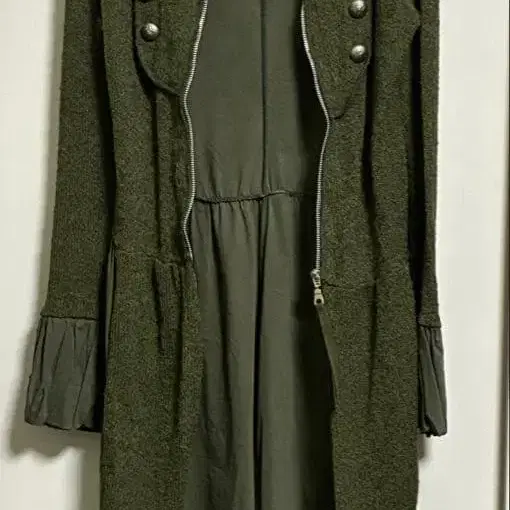 롱 가디건 올리브 그린 이소재 절개 긴팔 벌룬 소매