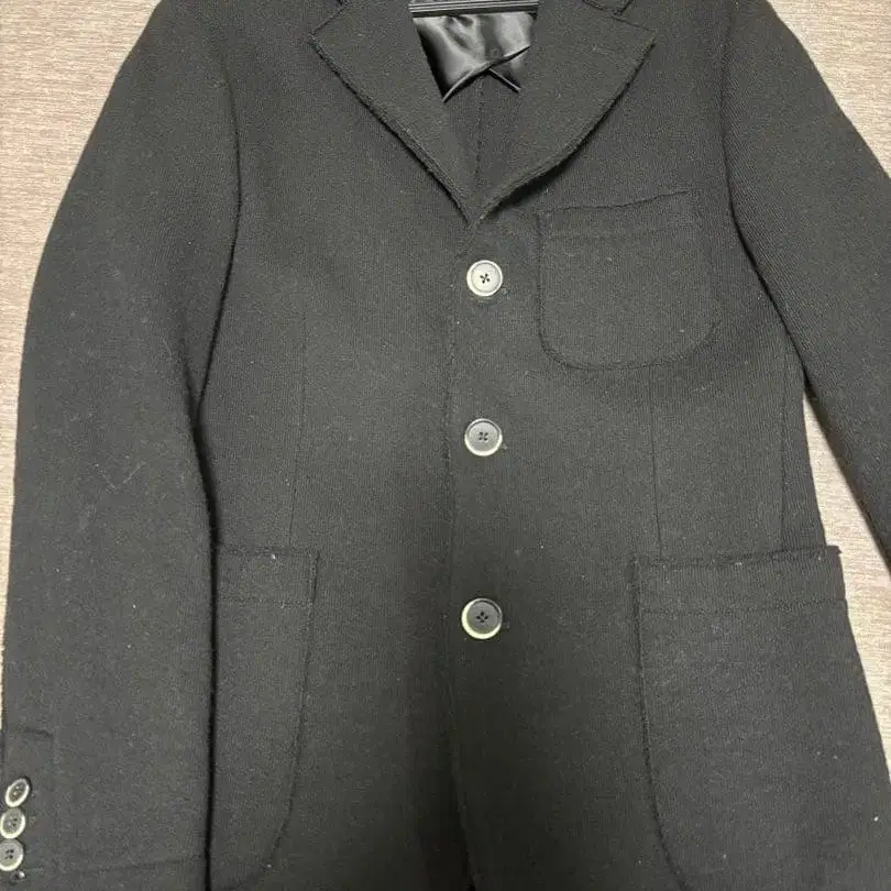 울 혼방 소재의 블랙 테일러드 자켓, 프론트 포켓과 버튼이 있습니다.