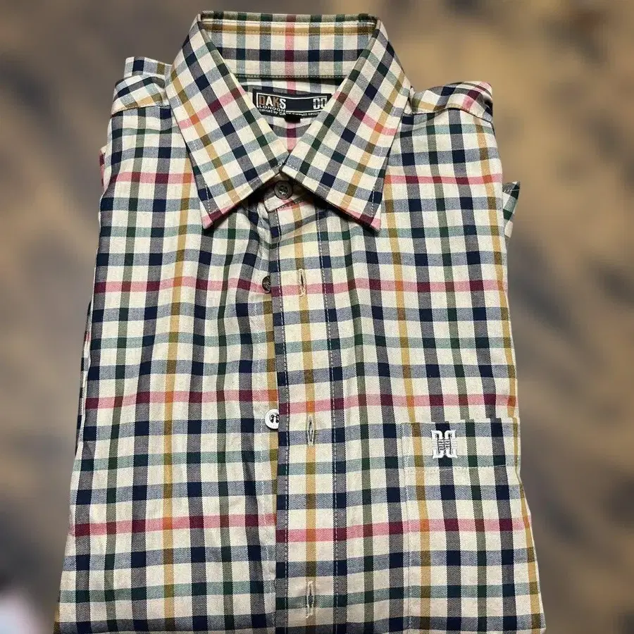다색 체크 무늬와 자수 로고가 특징인 DA KS의 M 사이즈 긴팔 셔츠. - 브랜드: DA KS - 사이즈: M - 색상: 체크 무늬 (다색) - 특징: 자수 로고 방문해 주셔서 감사합니다.