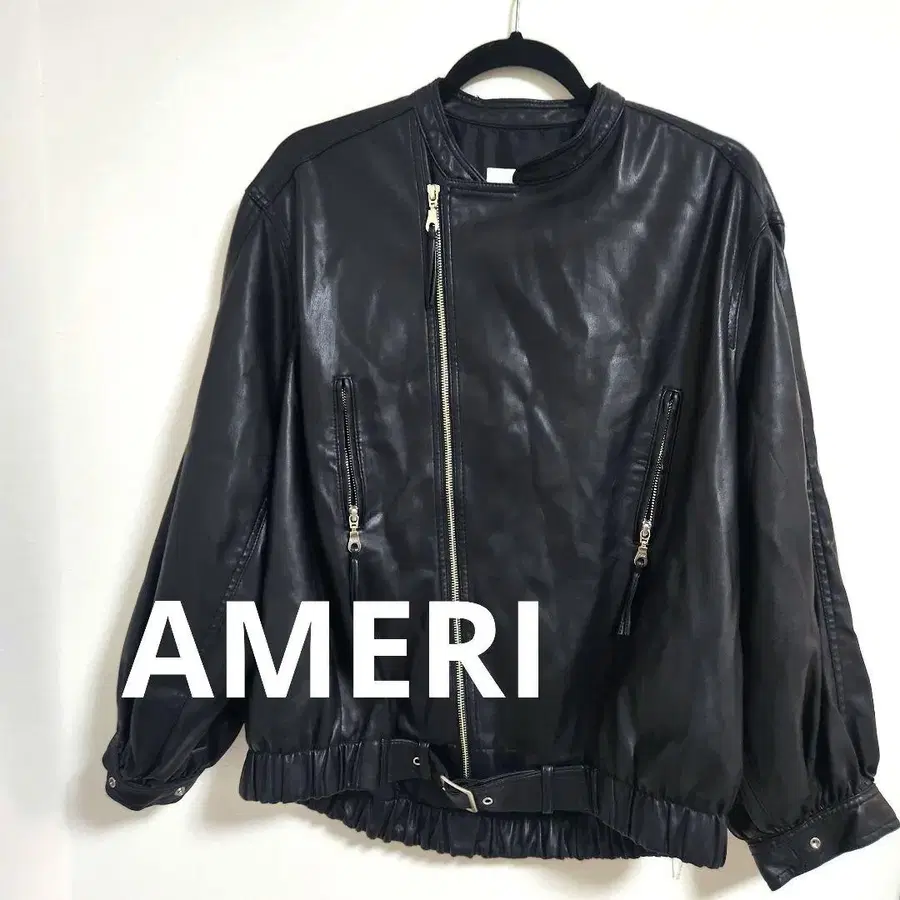AMERI의 블랙 가죽 자켓, 집업 디자인과 프론트 포켓 부착.