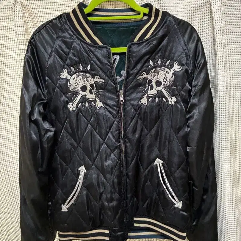 스컬 디자인의 블랙 자켓과 벨벳의 그린 자켓 리버서블 가을 겨울용 - 색상: 블랙 - 디자인: 스컬과 크로스본 자수 - 색상: 블랙 - 디자인: 스컬과 텍스트 자수 - 색상: 그린 - 소재: 벨벳 - 디자인: 자수 로고 방문해 주셔서 감사합니다. 어깨 너비/가슴 너비/소매 길이/기장 어깨 너비 - 래글런 가슴 너비 - 50cm 기장 - 60cm 전문가가 아닌 사람이 측정한 것이므로 약간의 오차가 있습니다. 예민하신 분께는 죄송합니다. 얼룩, 찢김, 냄새 등 - 없음 발송 후 노클레임/노리턴 부탁드립니다.