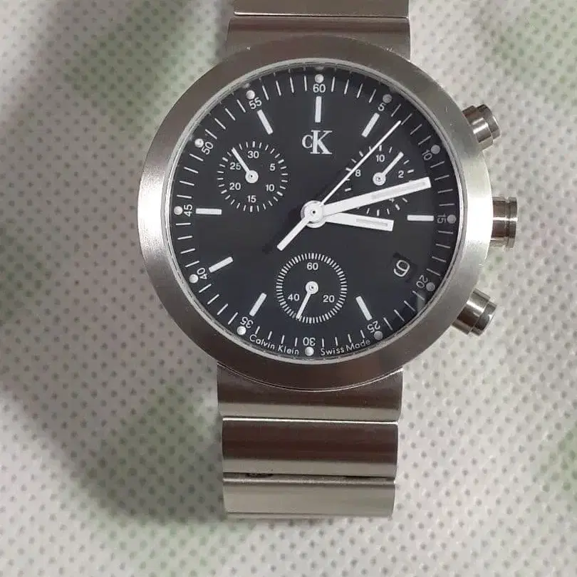 스테인리스 스틸 소재의 크로노그래프 손목시계, 블랙 다이얼, 날짜 표시 기능 포함. - 브랜드: CK - 색상: 블랙 - 소재: 스테인리스 스틸 - 타입: 크로노그래프 - 밴드 타입: 메탈 밴드 - 기능: 날짜 표시 방문해 주셔서 감사합니다.