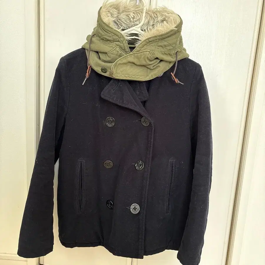 울 혼방 소재의 네이비 더블 브레스트 피 코트, 탈부착 가능한 후드 부착. - 색상: 네이비 - 디자인: 더블 브레스트 - 후드: 탈부착 가능한 후드 - 소재: 울 혼방 - 브랜드: DENIM&DUNGAREE - 자켓 타입: 피 코트 방문해 주셔서 감사합니다.