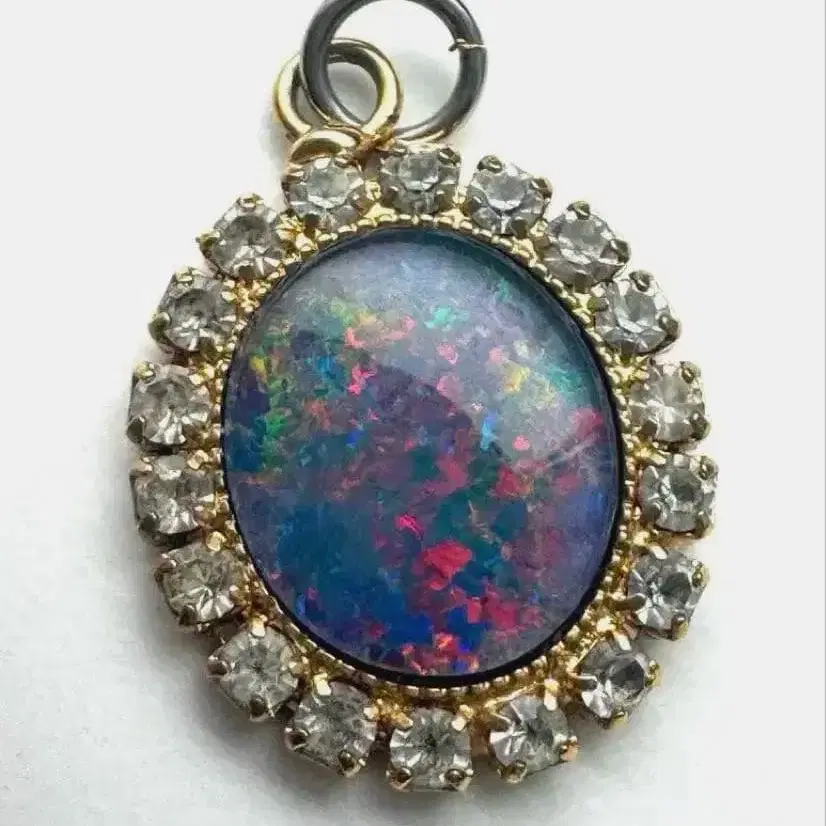 커다란 오팔을 중심으로, 주변에 크리스탈이 장식된 타원형 골드 참. 유색(파랑, 그린, 빨간색, 오렌지 등)이 많아, 오팔의 품질이 좋아 보입니다. 각도에 따라 다양한 표정으로 변하는 오팔과 크리스탈의 빛나는 아름다운 일품입니다. (사진으로는 다 담지 못해 아쉽습니다 - !) 주얼리를 좋아하는 할머니에게 물려받은 앤티크 일점입니다. 제가 잘 소화하지 못해, 소중히 사용해 주실 분을 찾고 있습니다. ※ 참만 있습니다. 체인은 포함되어 있지 않습니다. ※ 브랜드 등 자세한 내용은 알 수 없습니다. ※ 빈티지 제품이므로 사용감이 신경 쓰이는 분은 구매를 자제해주세요. - 사이즈: 약 15mm x 약 18mm - 소재: 오팔, 크리스탈 - 유색: 다색 (파랑, 그린, 빨간색, 오렌지 등) - 모양: 타원형 - 장식: 크리스탈 주변 장식, 골드 방문해 주셔서 감사합니다.