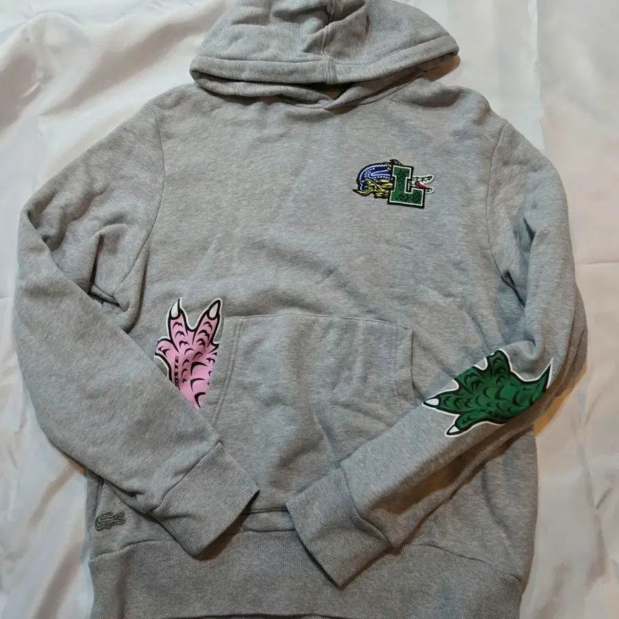 라코스테 그레이 후드티, 로고 와펜과 스트라이프 디자인이 특징. 중고 구제 의류 정도입니다. - 색상: 그레이 - 디자인: 로고 와펜 부착 기장 63cm 가슴 너비 52cm