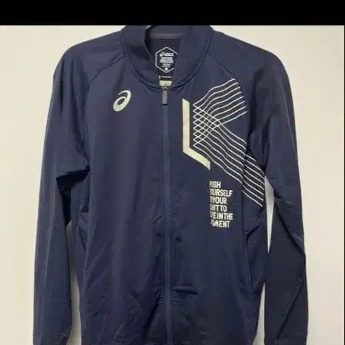 ASICS의 네이비 색상 저지입니다. 지퍼가 달린 스트라이프 디자인이 특징입니다. - 브랜드: ASICS - 색상: 네이비 - 디자인: 지퍼 포함 방문해 주셔서 감사합니다.