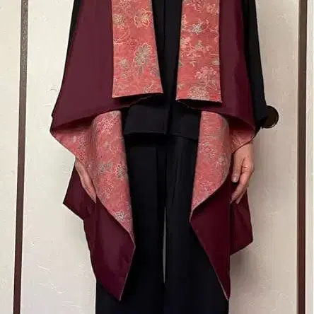 • 기모노 리메이크 후드 리버서블 코트 블랙 x 크림슨 오시마 명주