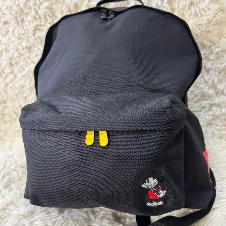 앞쪽 포켓의 지퍼가 미키마우스 신발과 같은 옐로우 컬러인 점, 미키마우스 디자인의 원포인트 자수, 미키가 전면에 너무 눈에 띄지 않는 점이 친근한 디자인입니다.