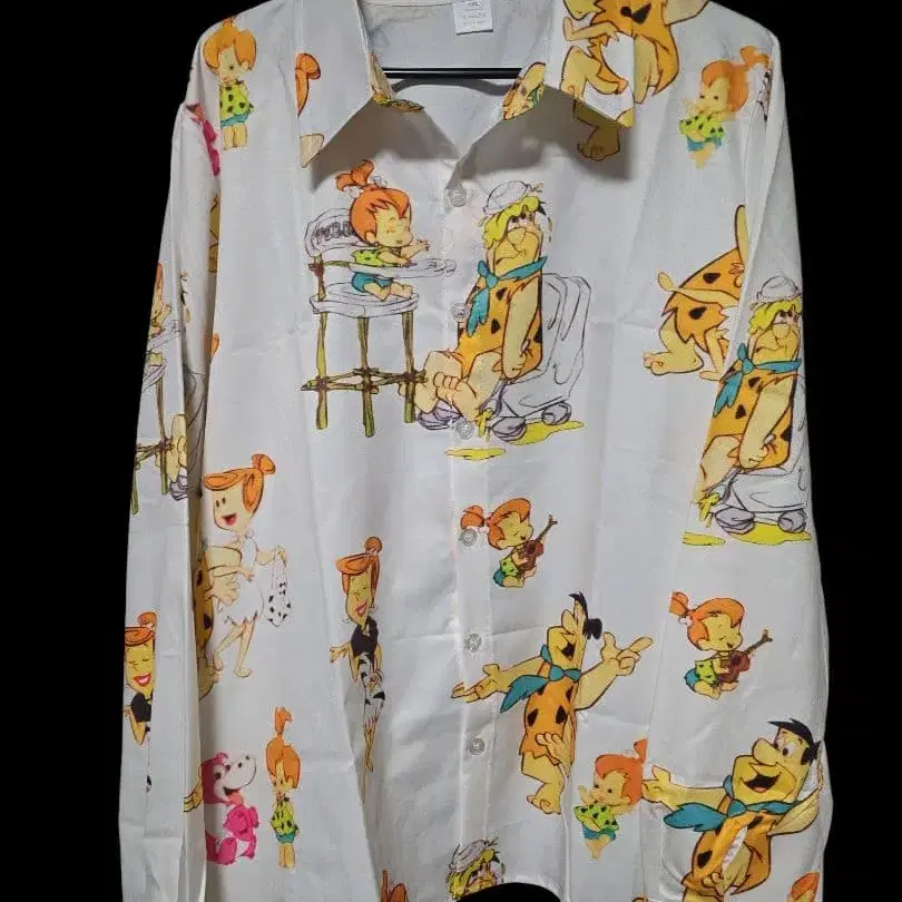 플린트 스톤 캐릭터가 전체에 프린트된 화이트 긴팔 셔츠입니다. 택은 2XL 기재 가슴 너비 59, 기장 65 - 디자인: 플린트 스톤 캐릭터 프린트 디자인 - 색상: 화이트 - 스타일: 긴팔 셔츠 방문해 주셔서 감사합니다.