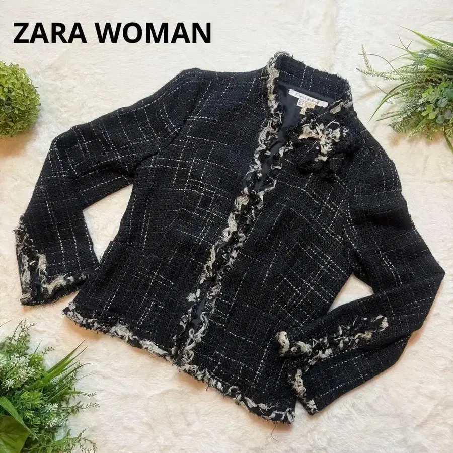 자동 번역되었어요. 원문보기노카라 디자인에 프린지 마감이 특징인 ZARA WOMAN 트위드 자켓입니다.