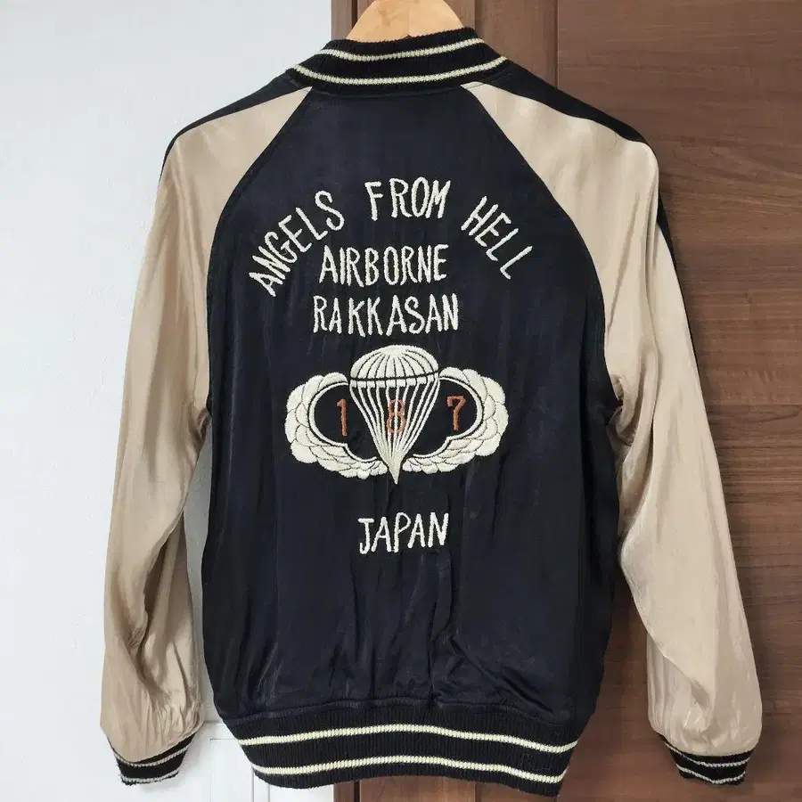 엠블럼 자수와 불독 디자인의 스카잔. - 디자인: 엠블럼 자수 (에어본, 천사) - 디자인: 독수리 자수 (양 가슴) - 디자인: 개 자수 (불독) - 연도: 1954-1958 - 국가: 일본제 빈티지 스카잔 리버서블 사이즈 - 남성: S, 여성: M 방문해 주셔서 감사합니다.
