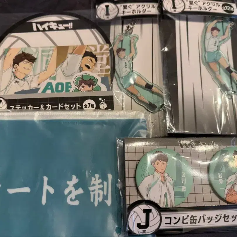 하이큐 해피 복권 아오바죠사이 세트입니다. Happy 복권 Happy 복권 아오바죠사이 고교 오이카와 토오루 이와이즈미 하지메 아오죠 K상 스티커 & 카드 세트 I상 '이어가는' 아크릴 키링 J상 콤비 캔뱃지 세트 H상 현수막 플랫 파우치