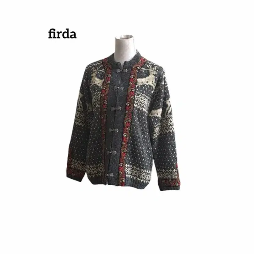 노르웨이산 자수 꽃무늬 로리안 니트 올 패턴 두꺼운 울 가디건