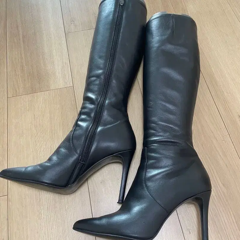 2회 착용 (총 4시간) ◎ 색상: 블랙 (검정) ◎ 특징: 스틸레토 (뾰족한 발가락 디자인) ◎ 핀힐 또는 얇은 하이힐 (약 9cm~9.5cm가 많음) ◎ 사이드 지퍼 있음 ◎ 소재는 천연 가죽으로 다리 라인에 맞는 슬림한 실루엣.