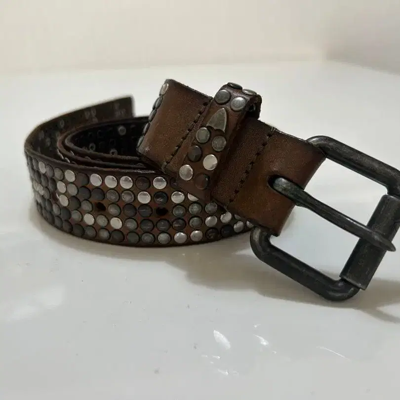 스터드가 달린 브라운 가죽 벨트, 메탈 버클 포함. - 색상: 브라운 - 디자인: 스터드 장식 - 버클 소재: 메탈 - 각인: D584, Made in USA - 특징: 가죽 소재 방문해 주셔서 감사합니다. 중고이며 사용감도 있습니다. 논클레임, 논리턴으로 부탁드립니다.