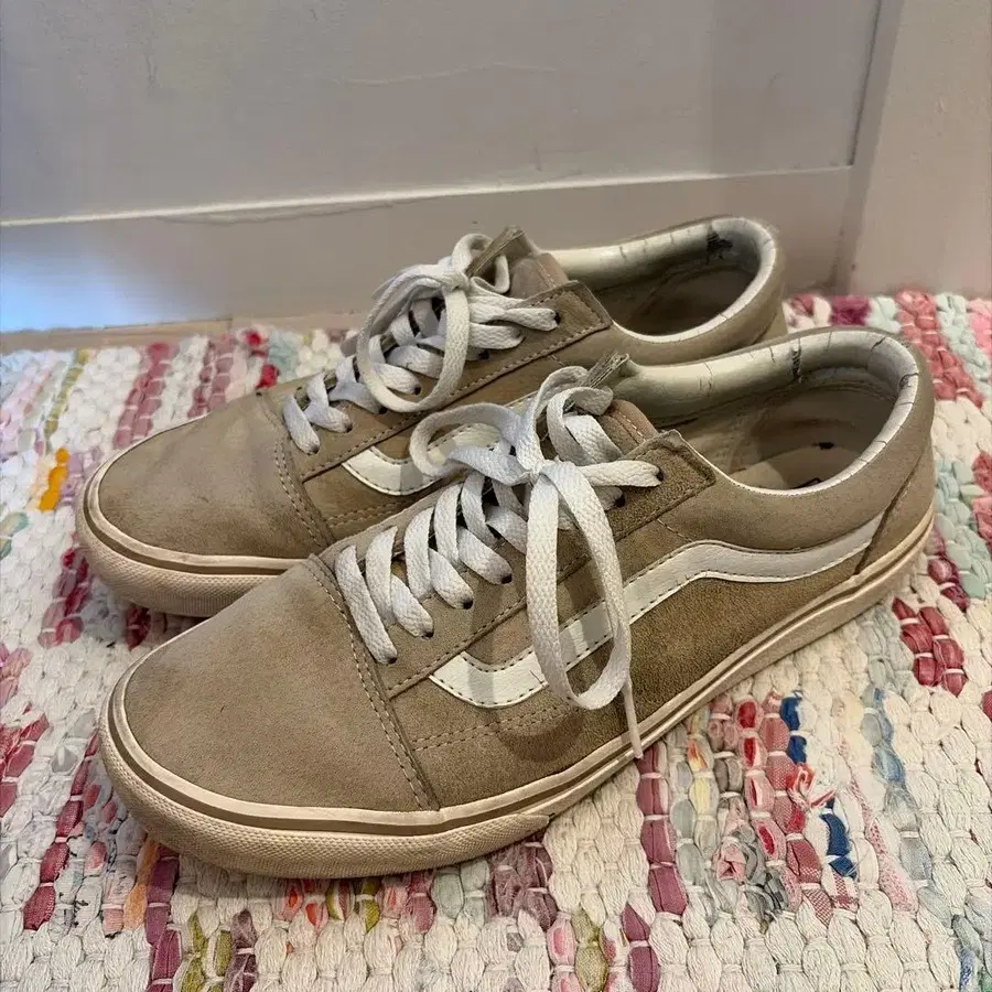 베이지 색상의 스웨이드 소재에 흰색 라인이 특징인 로우컷 스니커즈. - 색상: 베이지 - 디자인: 스웨이드 소재, 옆면에 흰색 라인 - 스타일: 로우컷 - 신발끈 색상: 화이트 - 밑창 색상: 크림색 방문해 주셔서 감사합니다.