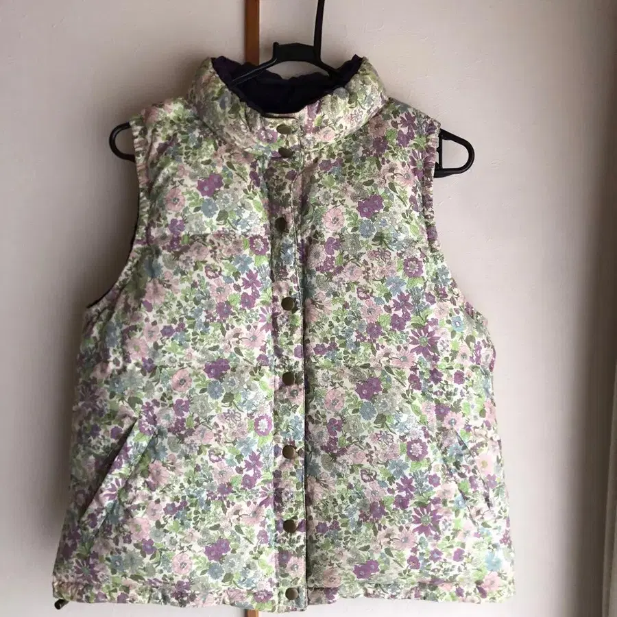 어떠신가요 ❓ 꽃무늬 디자인의 퀼팅 다운 베스트. - 디자인: 꽃무늬 - 색상: 그린 계열, 보라색 계열 - 스타일: 다운 베스트 - 소재: 퀼팅 보라색 착용 시 위에서 두 번째 스냅이 약간 뒤틀려 있지만 문제없이 잠깁니다. 리버티 에밀리 자택 보관품이므로 사진으로 확인 후, 이해와 동의 하에 구매 잘 부탁드립니다.