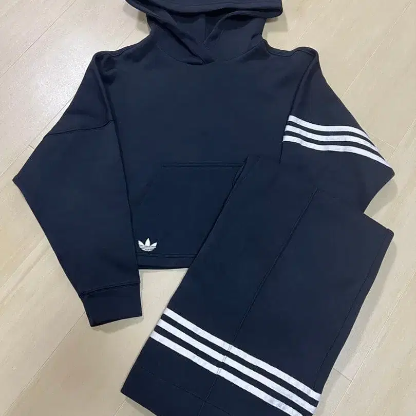 후드 부착 다크 블루 크롭 맨투맨, 3선 디자인이 특징입니다. - 브랜드: adidas - 색상: 다크 블루 - 디자인: 후드 부착 크롭 맨투맨 - 특징: 3선 디자인 - 포켓: 프론트 포켓 상의 트레이닝복 하의 와이드 맨투맨 셋업입니다. 팬츠의 밴딩 끈은 분실되었지만, 원래 밴딩이라 잘 맞습니다. 방문해 주셔서 감사합니다.