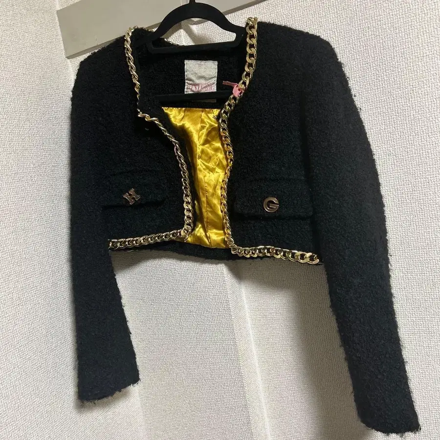 체인 장식의 블랙 숏 자켓, 안쪽은 골드 컬러. 가격 인하했습니다. - 브랜드: HYSTERIC GLAMOUR - 색상: 블랙 - 안쪽 색상: 골드 컬러 - 디자인: 숏 자켓 - 장식: 체인 포함 - 버튼: H와 G 로고 버튼 - 택: HYSTERIC GLAMOUR 방문해 주셔서 감사합니다.