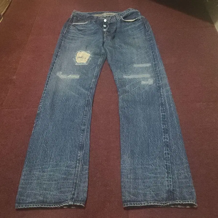 슈가케인 1947 리메이크 데님 w32 가죽 패치 숨김 리벳 체인 스티치