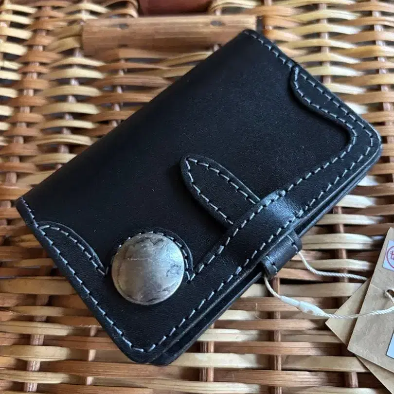 블랙 가죽의 컴팩트 명함지갑, 화이트 스티치 포함. - 색상: 블랙 - 소재: 가죽 - 디자인: 버튼이 달린 스냅식 - 사이즈: 컴팩트 - 특징: 화이트 스티치의 악센트 - 상태: 미사용 새상품 방문해 주셔서 감사합니다.