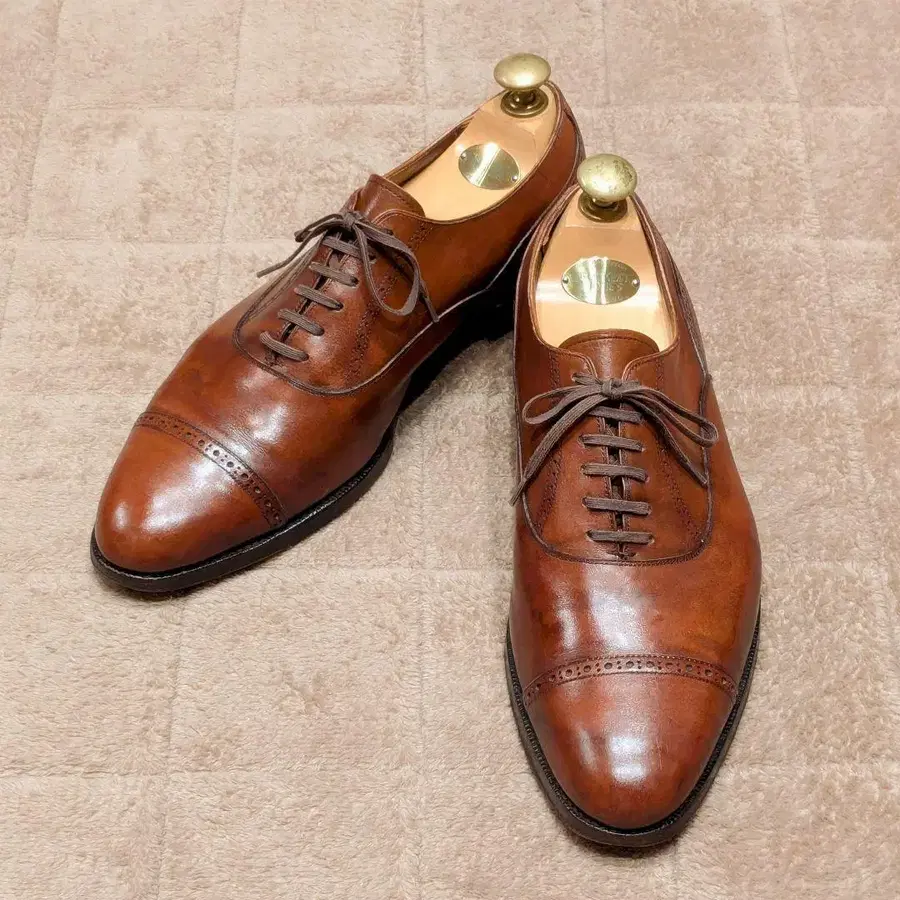 신발 셀렉샵 '트레이딩 포스트'의 프레스티지 컬렉션 제품입니다. 노포 제조사 센트럴 슈즈에서 제조되었으며, 높은 기술을 필요로 하는 비스포크 유래의 디자인을 아낌없이 채용했습니다. 소재, 제법, 착용감 모든 면에서 일본산 기성 신발의 탑클래스에 자리매김한 시리즈입니다. [ 상품 설명 ] 비즈니스 장면이나 드레스 코드 등 포멀한 상황에서 활약하는 내피식 펀치드캡토입니다. 어퍼에는 상급의 카프가 채용되어, 극상의 광택을 엿볼 수 있습니다. 기계식 신발임에도 비스포크 슈즈로 착각할 정도의 마감으로, 능숙한 장인 정신으로 제작된 극상의 프로덕트입니다. [ 사이즈 ] 사이즈는 US 8 아웃솔 세로 길이는 30cm 아웃솔의 가로 길이는 10.5cm입니다. [ 컨디션 ] 어퍼에 평소 사용에 따른 약간의 흠집이 있습니다. 어퍼에 약간의 색상 불균일 같은 것이 있습니다. 탑리프트와 밑창의 마모는 적어 교환할 필요는 없을 것 같습니다. 에어캡으로 정성스럽게 싸서 종이상자에 넣어 배송합니다. 상품은 신발 본체만 해당됩니다.