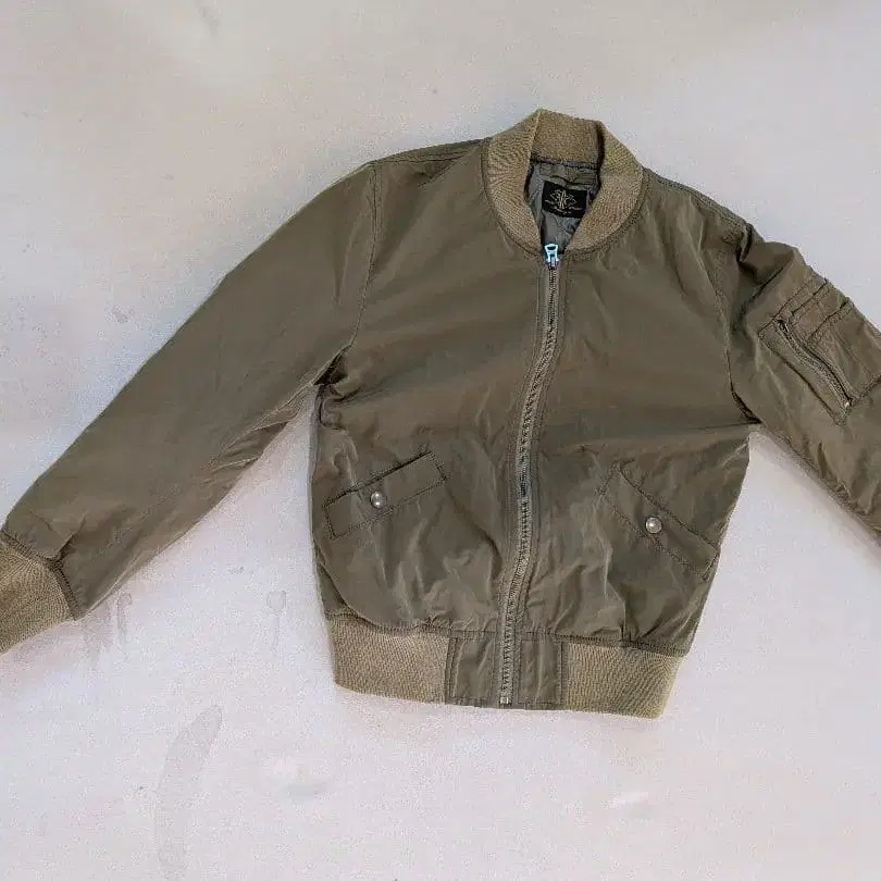 자동 번역되었어요. 원문보기카키 MA-1 스타일 자켓, 왼쪽 팔에 지퍼 포켓 부착.