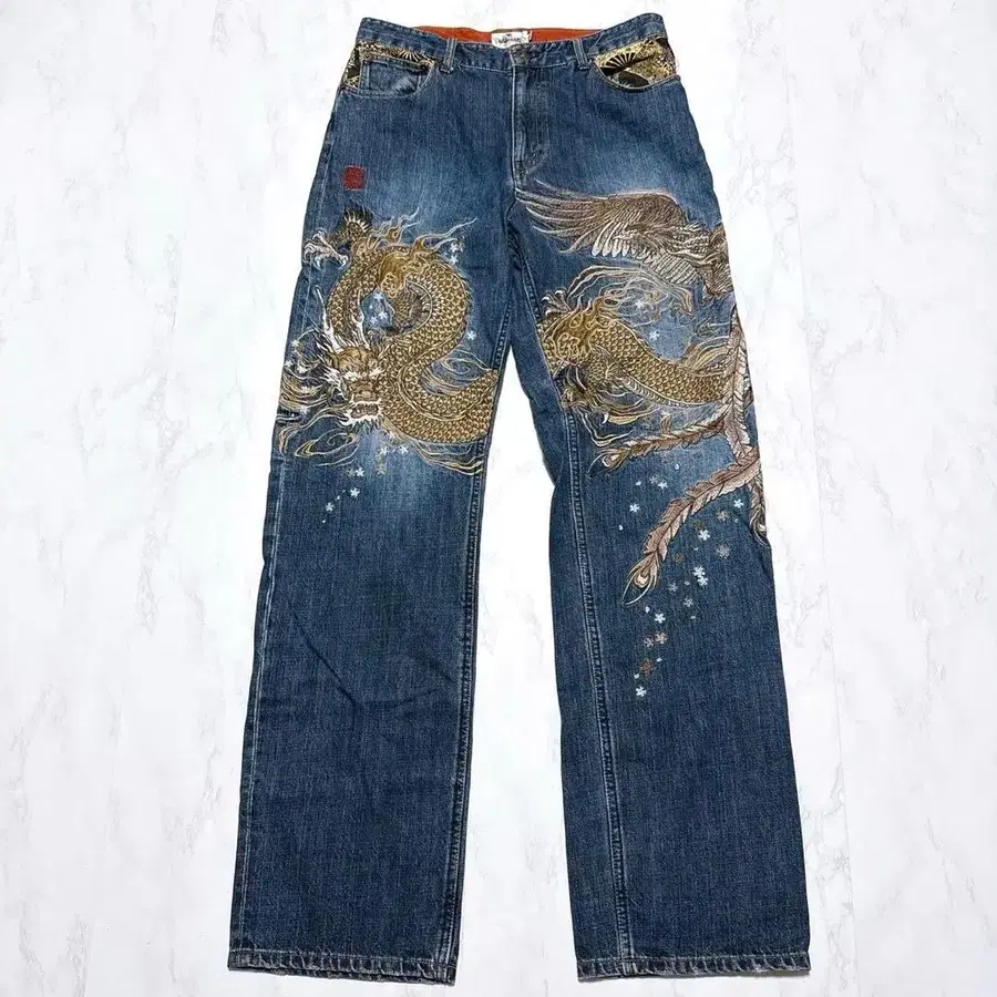 카라쿠리타마시 데님 팬츠 용 드래곤 봉황 피닉스 자수 w36 금 자수