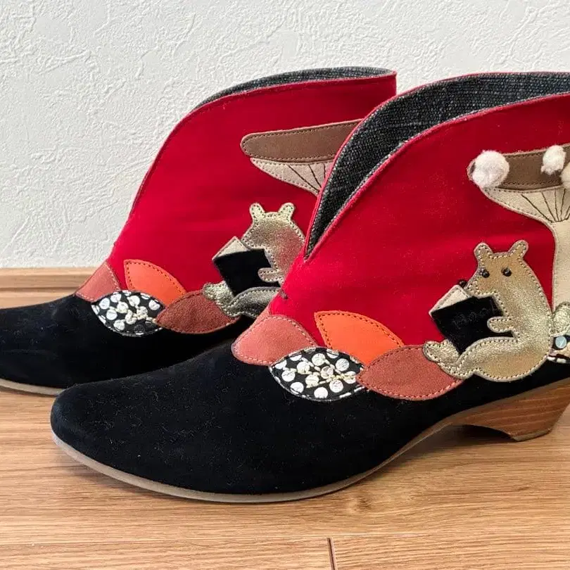 히미코 계열의 WANONANO 스웨이드 숏부츠. 곰은 샴페인 골드이며, 매트한 스웨이드와의 대비가 귀여우면서도 멋진 부츠입니다. 사이즈는 22.5cm입니다. 힐 높이는 약 3.5~4cm입니다. 마음에 들어 아꼈지만, 너무 아끼다 사이즈가 맞지 않게 되었습니다.. 발가락 부분 등에 스웨이드 스크래치 없이 새 상품급입니다. 츠모리치사토를 좋아하시는 분들께도 추천합니다. 프랑슈리페 franche lippée 츠모리치사토 FRAPBOIS 메르시보쿠 Né-net 로이스크레용 Emily Temple Cute Jane Marple 등을 좋아하시는 분들께. - 색상: 빨간색과 블랙의 콤비네이션 - 디자인: 동물 모티브 자수 - 스타일: 앵클부츠 - 소재: 스웨이드와 캔버스 - 장식: 비즈와 폼폼 포함 방문해 주셔서 감사합니다. 색상 - 레드 계열 소재 - 천연 가죽