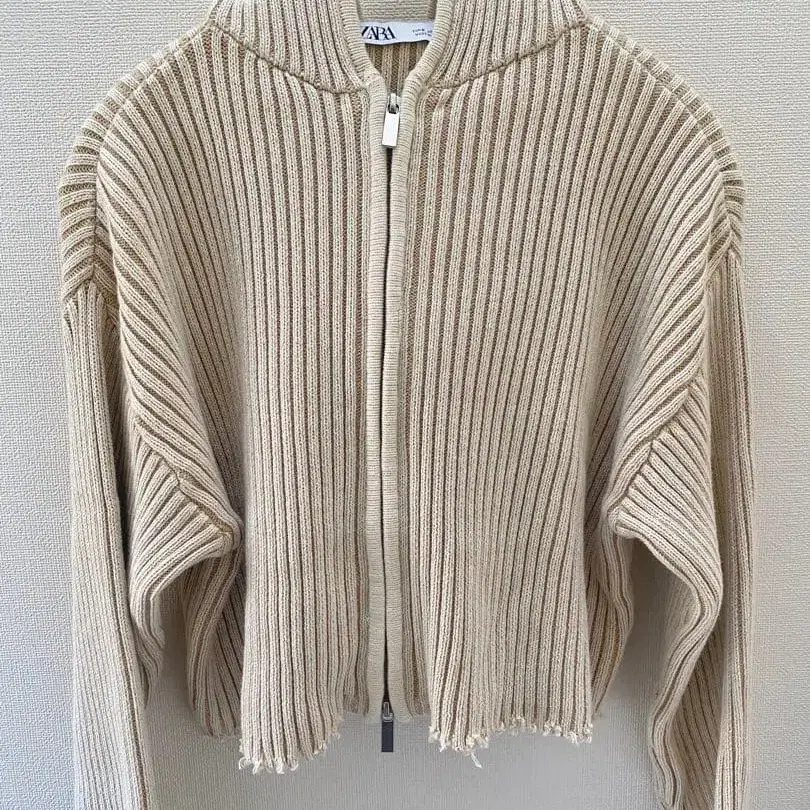 ZARA 더블 지퍼 리브 니트 크롭 후드티 컬러: 아이보리, 미색 사이즈: S 기장 41cm, 가슴 너비 52cm, 어깨 너비 50cm, 소매 길이 55cm 1회 단시간 착용 후 자택 보관했습니다. 얼룩, 오염 없이 새상품급입니다. 밑단과 소매가 컷팅 디자인입니다. 크롭 기장이므로 와이드 팬츠와 균형감 있게 착용하실 수 있습니다. ZARA Zara 자라