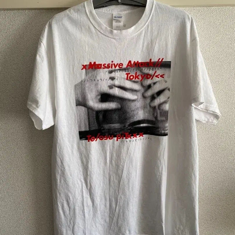 2017년 도요스 PIT에서 열렸던 일본 공연 당시의 T셔츠입니다. 미사용 새상품이며 판매를 위해 세탁을 1회 했습니다. 전체 길이 75.5cm, 어깨 너비 50.7cm, 가슴 너비 52.5cm 바디는 길단 울트라 코튼 L 사이즈입니다. #massiveattack #밴드티셔츠 #밴티