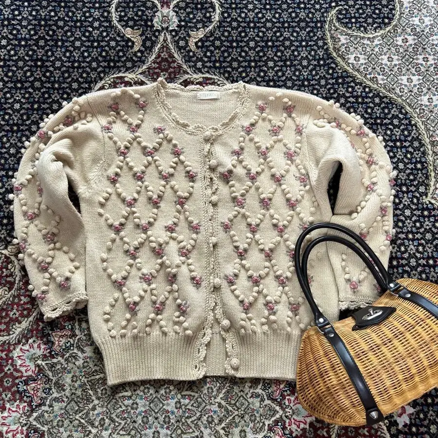 울 100% 장미 자수 장식 가디건 L 여분 단추 포함 쿨톤 베이지