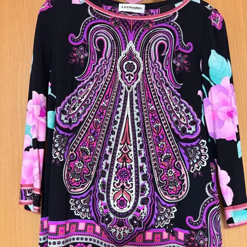 페이즐리 무늬가 특징인 LEONARD의 실크 상의. 클리닝 완료되었습니다. - 브랜드: LEONARD - 색상: 블랙, 핑크, 스카이블루 - 디자인: 페이즐리 무늬 - 소매 길이: 7부 소매 방문해 주셔서 감사합니다.