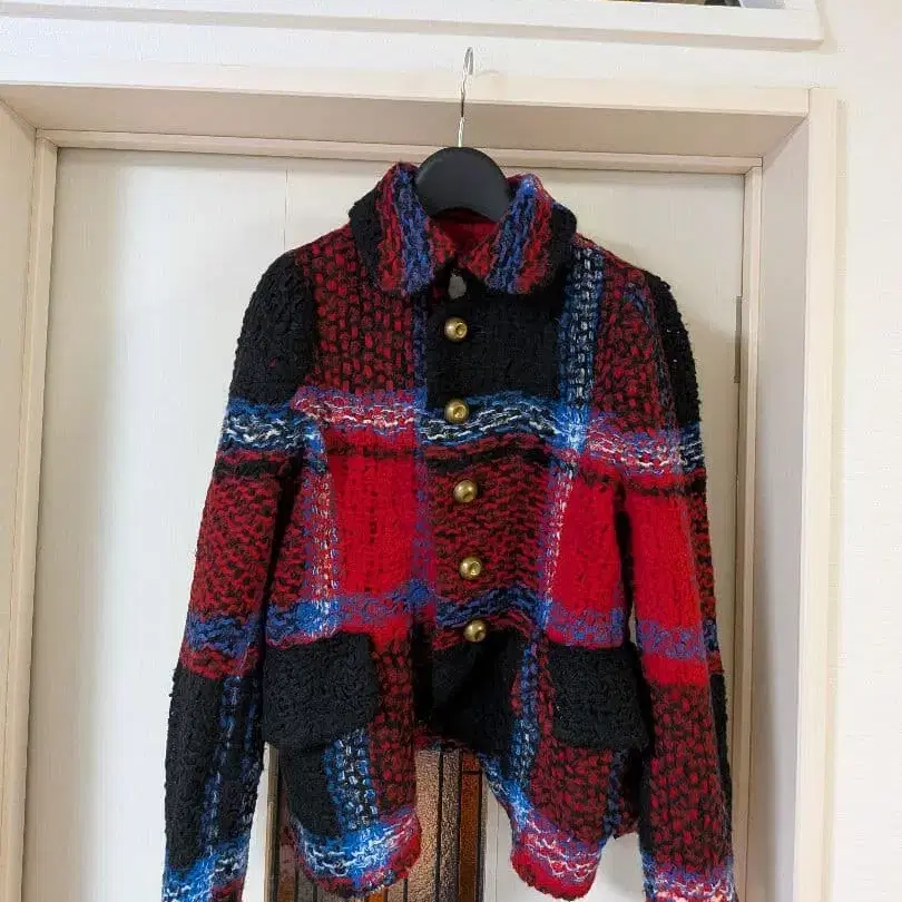 빨간색, 블랙, 파랑 체크 무늬에 골드 컬러 버튼이 특징인 숏 기장 자켓. - 브랜드: sunaokuwahara - 컬러: 빨간색, 블랙, 파랑 체크 무늬 - 버튼: 골드 컬러 버튼 - 디자인: 숏 기장, 카라 부착 방문해 주셔서 감사합니다. 하자품은 안감에 3-4곳 바늘로 뚫은 듯한 작은 구멍이 있습니다. 안감이라 눈에 띄지는 않지만 - 이미지 참조 부탁드립니다. 로 게이지 짜임이라 짜임 방법이 넓은 곳도 있습니다만, 아마 원래 디자인일 것입니다. 이는 어디까지나 개인적인 주관입니다. 자택 보관품입니다. 그 과정에서 다른 의류의 냄새가 옮겨올 수 있습니다. 개와 함께 살고 있으므로 최대한 주의하겠지만 털이 부착될 수 있습니다. 예민하신 분, 알레르기 등이 있으신 분은 삼가해 주시기 바랍니다. 컴팩트하게 접어 압축 발송해 드리므로, 접는 과정에서 주름이 발생합니다(._.)