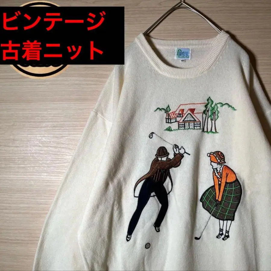 레어 빈티지 니트 L 빅 자수 골프 쇼와 레트로 얇은 소재 구제 의류