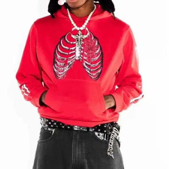 레드 골격 디자인 후드 부착 후드티 NOREMID