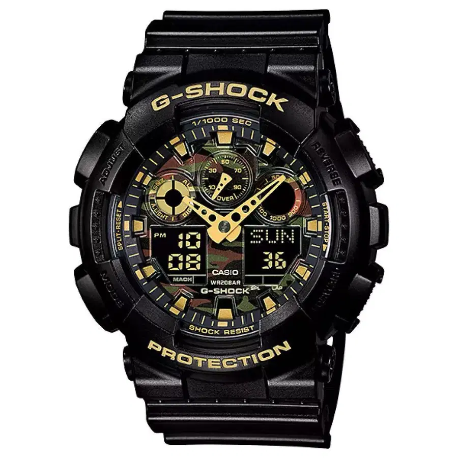 20기압 방수와 쇼크 레지스트를 갖춘 G-SHOCK입니다. 다이얼이 메탈릭 카모플라쥬 모델입니다.