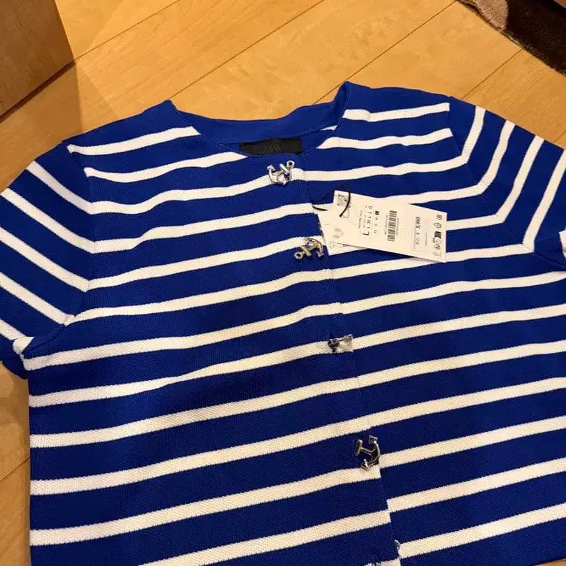 파랑과 화이트 스트라이프 디자인, 닻 모양 버튼이 달린 반팔 니트 - 색상: 파랑과 화이트 스트라이프 - 디자인: 닻 모양 버튼 포함 - 사이즈: L - 스타일: 니트 반팔 방문해 주셔서 감사합니다.