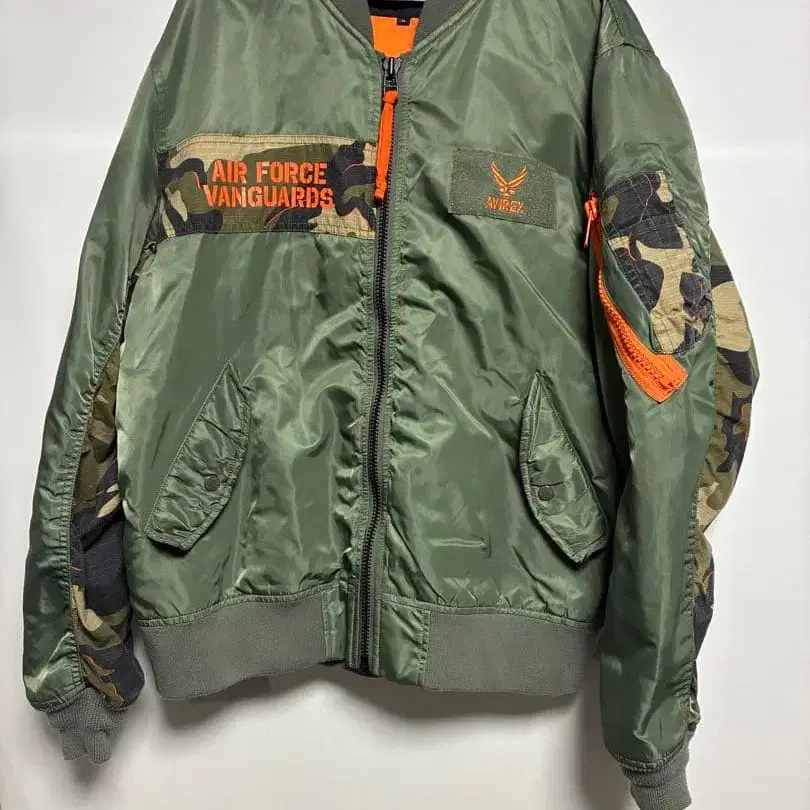 [ 가격 인하했습니다 ] 카모 패턴과 오렌지 색상의 악센트가 특징인 AVIREX제 플라이트 자켓. - 브랜드: AVIREX - 사이즈: XL - 디자인: 카모 패턴과 오렌지 색상의 악센트 - 특징: AIR FORCE VANGUARDS와 FUTURE COMMAND 프린트 방문해 주셔서 감사합니다.