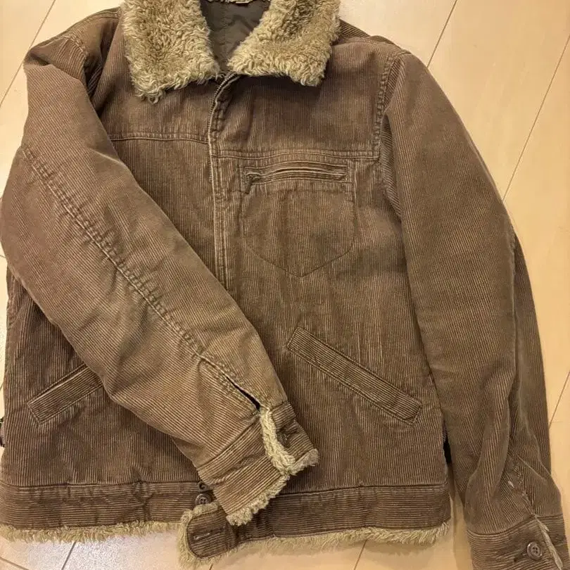 코듀로이 소재의 브라운 점퍼, 보아 안감 부착으로 보온성이 뛰어납니다. 유니클로 제품으로 M 사이즈입니다. 안감이 보아 소재로 매우 따뜻합니다. 클리닝 후 보관했습니다. 소매에 얼룩이 있는 곳이 1곳 있습니다.