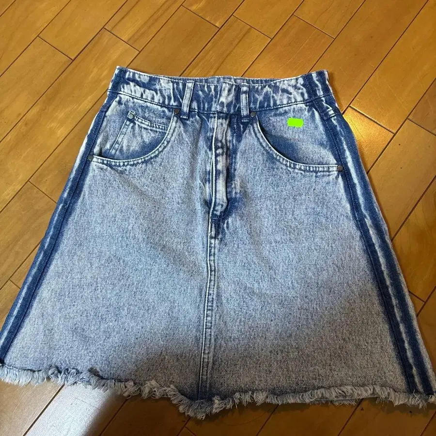 데님 블루 색상의 adidas 미니 스커트로, 프린지 밑단과 백 포켓이 있습니다.