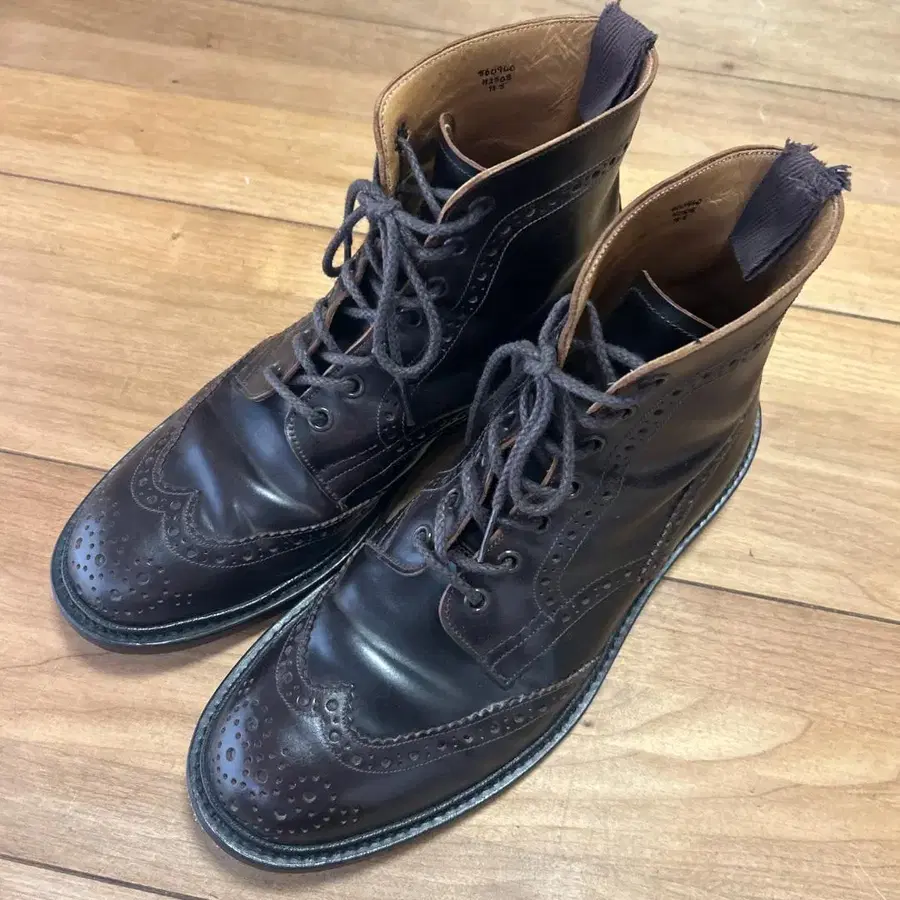 트리커스 Tricker's 코도반 컨트리 부츠 72508 사이즈는 UK 7.5입니다. 코도반 소재의 컨트리 부츠입니다. 코도반 소재는 드물며, 특히 버건디 색상은 흔하지 않을 것이라고 생각합니다. 알든의 버건디 색상과 유사합니다. 맑은 날에만 몇 번 착용했습니다. 왼쪽 풀 스트랩에 약간의 찢김(사진 10번째)이 있지만, 전반적으로 가죽 상태가 매우 좋으며, 밑창은 가죽 밑창으로 아직 깨끗합니다. 앞으로도 오래 사용하실 수 있을 것이라고 생각합니다. *구매 시 제공되었던 트리커스의 복조리 주머니가 포함됩니다. 상자는 없습니다. 사이즈 - 7.5 (약 26.5cm) 색상 - 브라운, 버건디 소재 - 천연 가죽