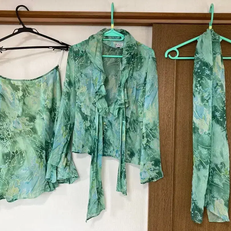실크 소재 그린 계열 꽃무늬 스커트 셋업 스카프 스페어 포함