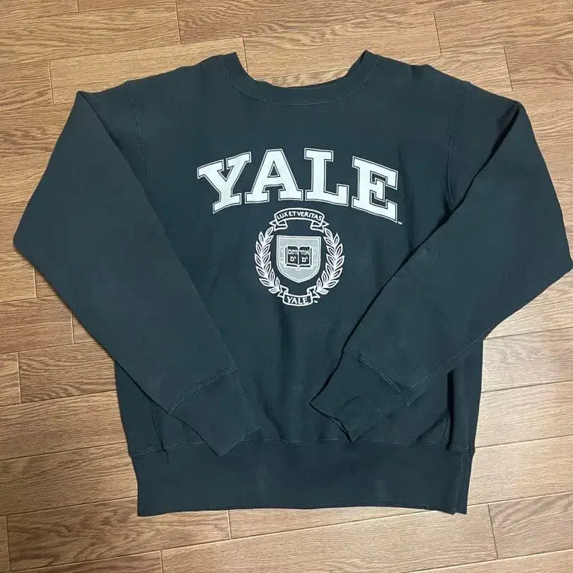 Yale University 로고가 들어간 Champion 제조의 블랙 맨투맨. 빨간색 택입니다.